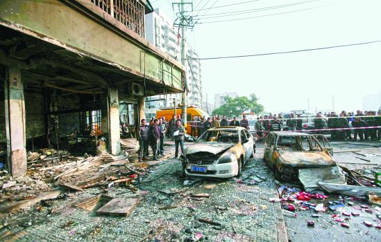 凈水住宅區(qū)5幢以及路對面的銀來花苑C3幢受到爆炸的影響最大。一樓基本已經被爆炸引起的大火燒得面目全非,周邊300米范圍內的近30家店面門窗均被震碎,很多停在路邊的車輛受損,其中兩輛車已經被燒得只剩下空殼。